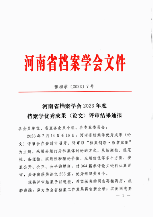 获奖河南省档案学会2023年度档案学优秀成果(论文)——严巍