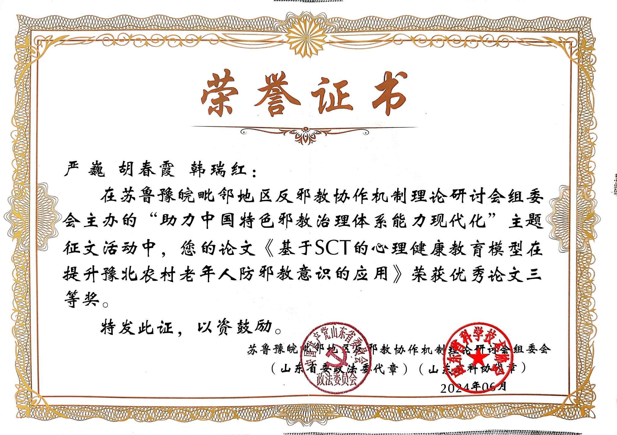 荣获山东省反邪教优秀论文三等奖——严巍