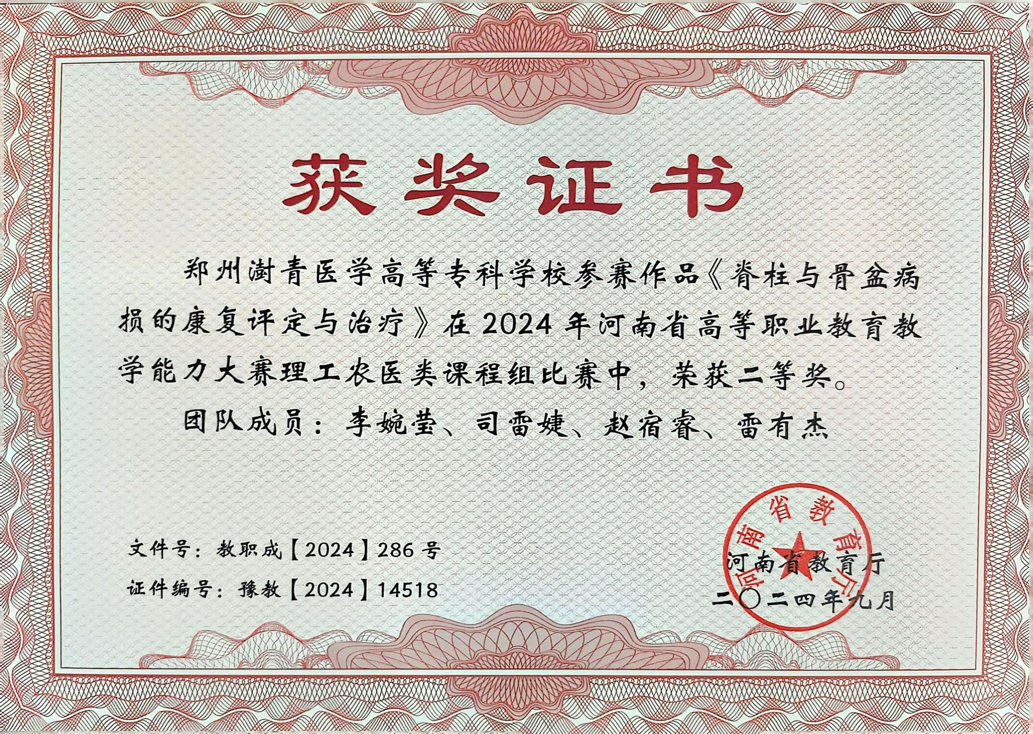 获奖2024年河南省高等职业教育教学能力大赛理工农医课题组