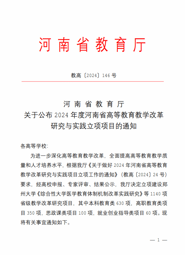 立项2024年度河南省高等教育教学改革研究与实践项目