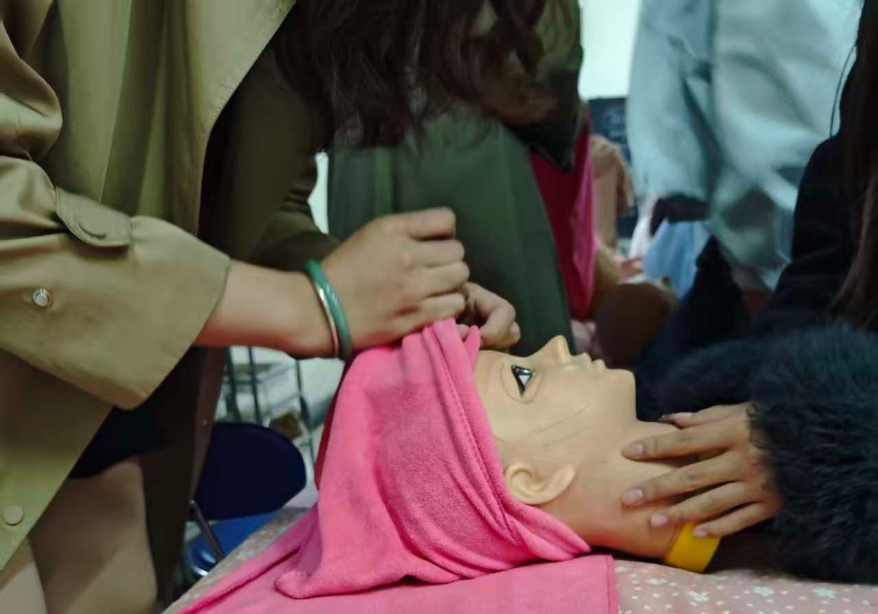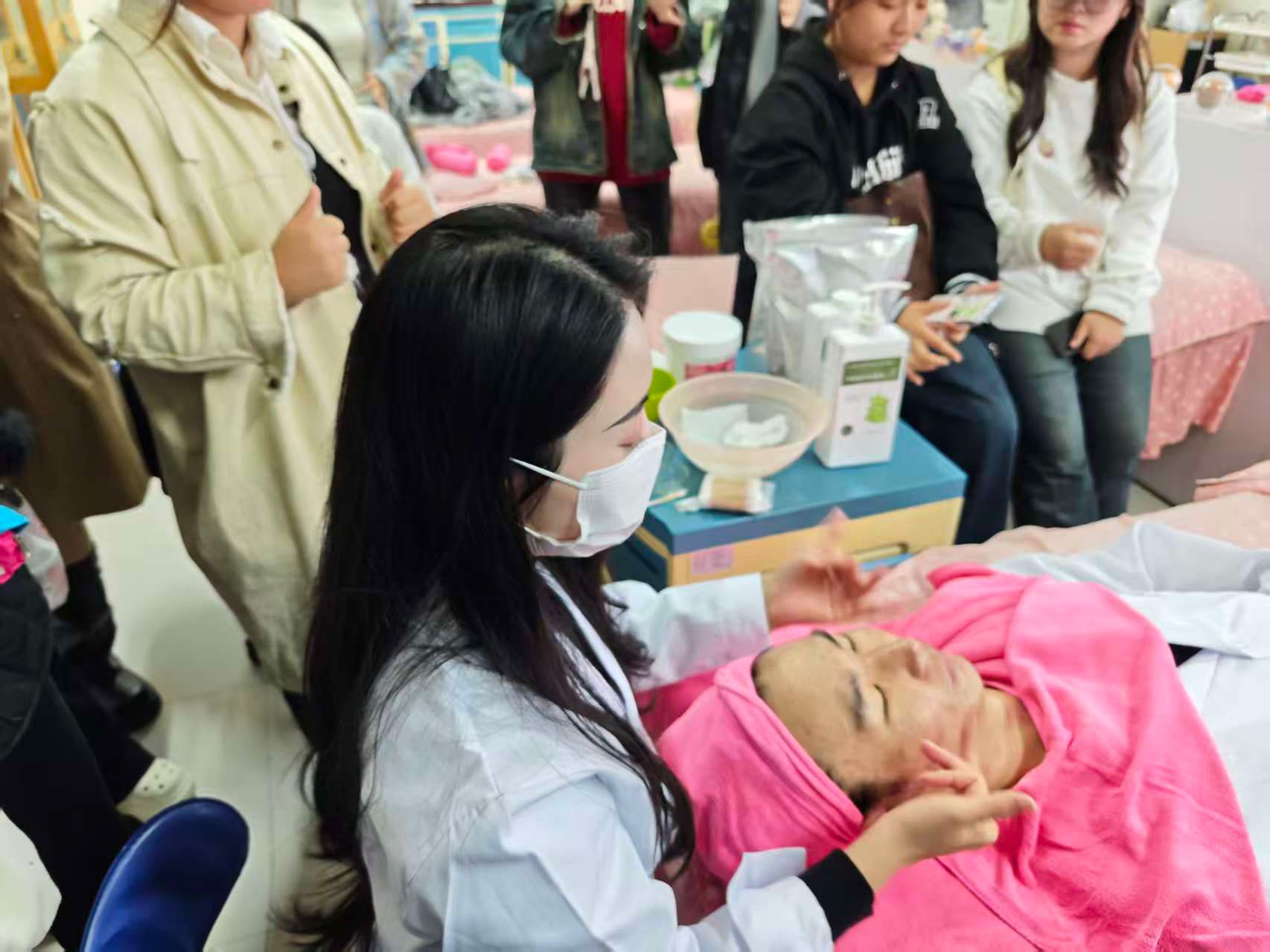 紧随其后的分组实操演练将整场活动推向高潮。在老师的专业指导下,同学们分组进行了完整的面部清洁与基础护肤流程操作。大家热情投入,相互交流手法与心得,指导老师则穿梭于各小组之间,进行“手把手”的纠正与答疑,确保了每一位同学都能掌握正确的护肤技巧。