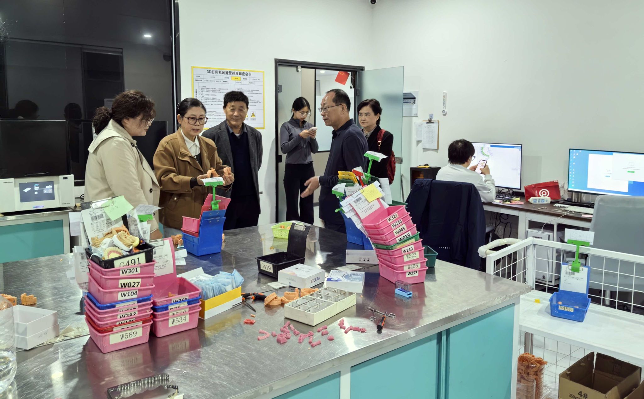 考察团队首先走进企业数字化义齿生产车间,实地观摩口腔修复体全流程加工工艺,详细了解数字化扫描、3D打印、打磨调试等核心工序。现场,企业技术骨干直观演示设备标准化操作流程,深入解读产品质量检测标准与行业技术规范。考察过程中,马惠萍院长一行还特意看望了正在企业实习的学院学子,与同学们亲切交流,详细询问岗位适应、技能提升及生活保障等情况。张总对同学们在实习期间展现出的认真态度、扎实功底和良好表现给予充分肯定,当场表扬道:“各位同学的实习表现非常出色,既贴合岗位需求,又能快速吸收实操技能,值得肯定!”