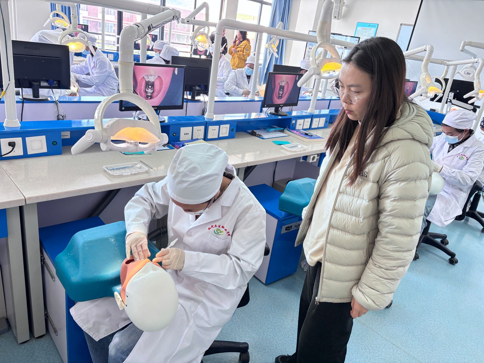 12月16日,老师们深入红河卫生职业学院实训中心,现场观摩了口腔卫生保健专业实训教学课程。龈上洁治术、窝沟封闭术等实训课程是口腔卫生保健专业的核心技能课程,对学生的操作规范性和临床思维能力培养至关重要。在观摩过程中,陈婉璐主任认真记录了教学环节的设计与实施情况,马惠萍院长、何冰冰教授与授课教师进行了深入交流和指导。
