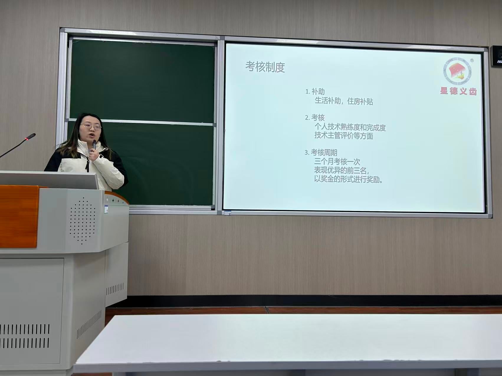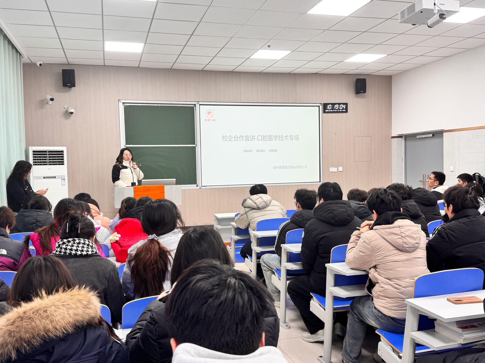 2025年12月25日,郑州星德医疗器械有限公司走进郑州健康学院,举办了一场关于2026年“星德”冠名班招生的校企合作宣讲会。此次宣讲会由口腔健康学院副院长董传莹主持,企业行政部主管张雅怡、运营部张威担任主讲,生产部主管于凯伦、设计部主管王义帅、校优秀实习生岳恒贤以及2024级口腔医学技术班全体学生参加。