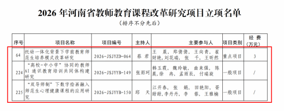 近日,根据《河南省教育厅关于公布2026年河南省教师教育课程改革研究项目立项名单的通知》(教师〔2025〕246号),我校成功获批3项立项,其中1项重点项目获得专项经费支持。