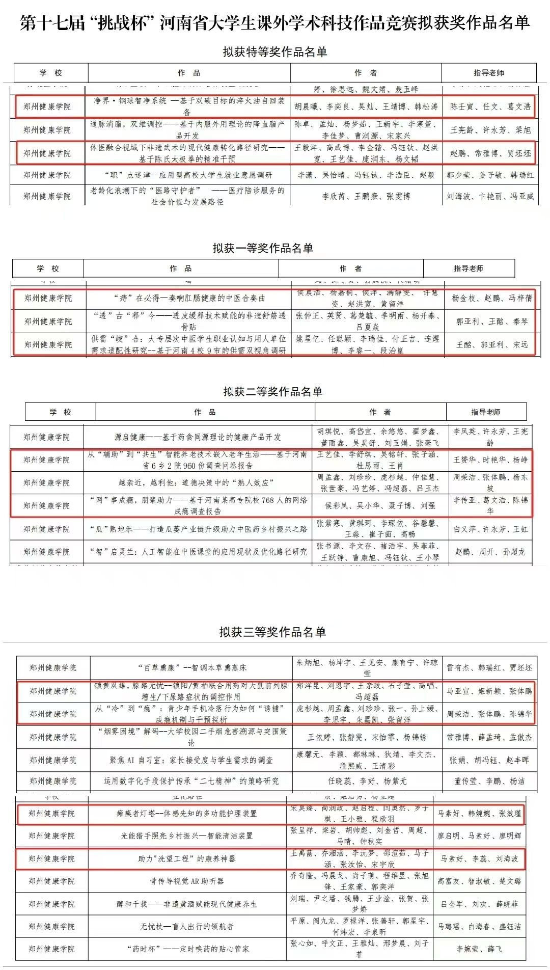 近日,河南省大学生课外学术科技作品竞赛组委会公示了第十七届“挑战杯”拟获奖作品名单,我校健康医学院学子凭借扎实的专业素养、创新的科研思维与严谨的实践探索,在众多参赛作品中脱颖而出,一举斩获2项特等奖、3项一等奖、4项二等奖、4项三等奖,获奖等级与数量均创历史新高,充分展现了学院在医学人才培养与科研创新领域的卓越实力。