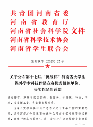近日,由共青团河南省委、河南省教育厅、河南省社会科学院、河南省科学技术协会、河南省学生联合会共同举办的第十七届“挑战杯”河南省大学生课外学术科技作品竞赛成绩公布,我校推报的27项参赛作品全部获奖,其中特等奖5项,一等奖3项,二等奖6项,三等奖13项,在获奖数量和获奖等级上均实现跨越式提升。