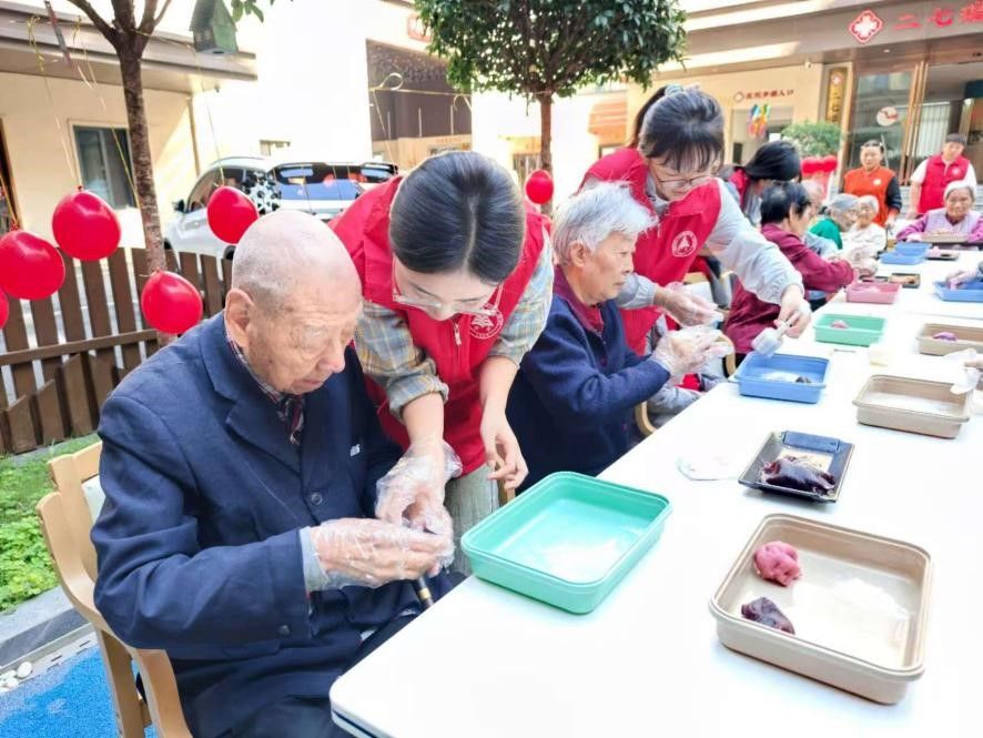紧接着游园会正式拉开序幕前,同学们小心翼翼地将老人护送至活动现场,用专业的照护细节让老人们感受到无微不至的关怀。在制作冰皮月饼环节,同学们一边向老人们讲解冰皮月饼的制作步骤,一边手把手地指导老人揉面团、包馅料、压模具。现场欢声笑语不断,一块块晶莹剔透的冰皮月饼,不仅承载着节日的甜蜜,更拉近了师生与老人们的距离。