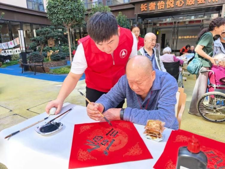 活动接近尾声时,“毛笔字书写祝福” 环节温馨上线。老人主动拿起毛笔,写下对祖国的祝福与对美好生活的期盼。一幅幅饱含深情的书法作品,成为了双节最珍贵的礼物。