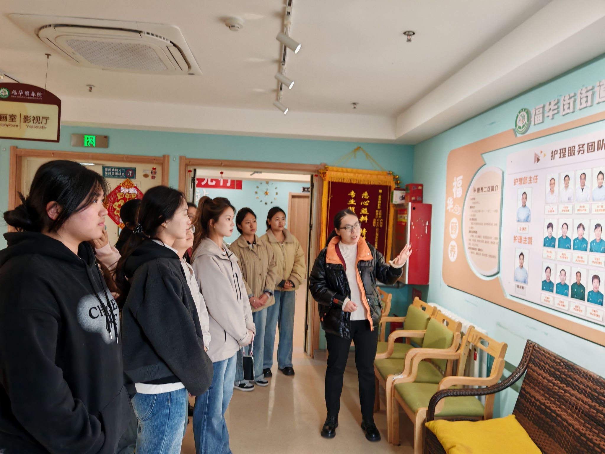 座谈交流前,福华颐养院工作人员带领同学们参观院区。作为集生活照料、康复护理、文娱活动于一体的专业养老机构,这里有专业护理员与医护团队24小时保障老人安全,设有营养餐厅、康复室等功能区域,提供定制餐食、健康监测、兴趣课程等服务。秉持“让老人有尊严、有品质安享晚年”的理念,温馨的环境与细致的照护,让同学们直观感受到专业养老服务的温度。