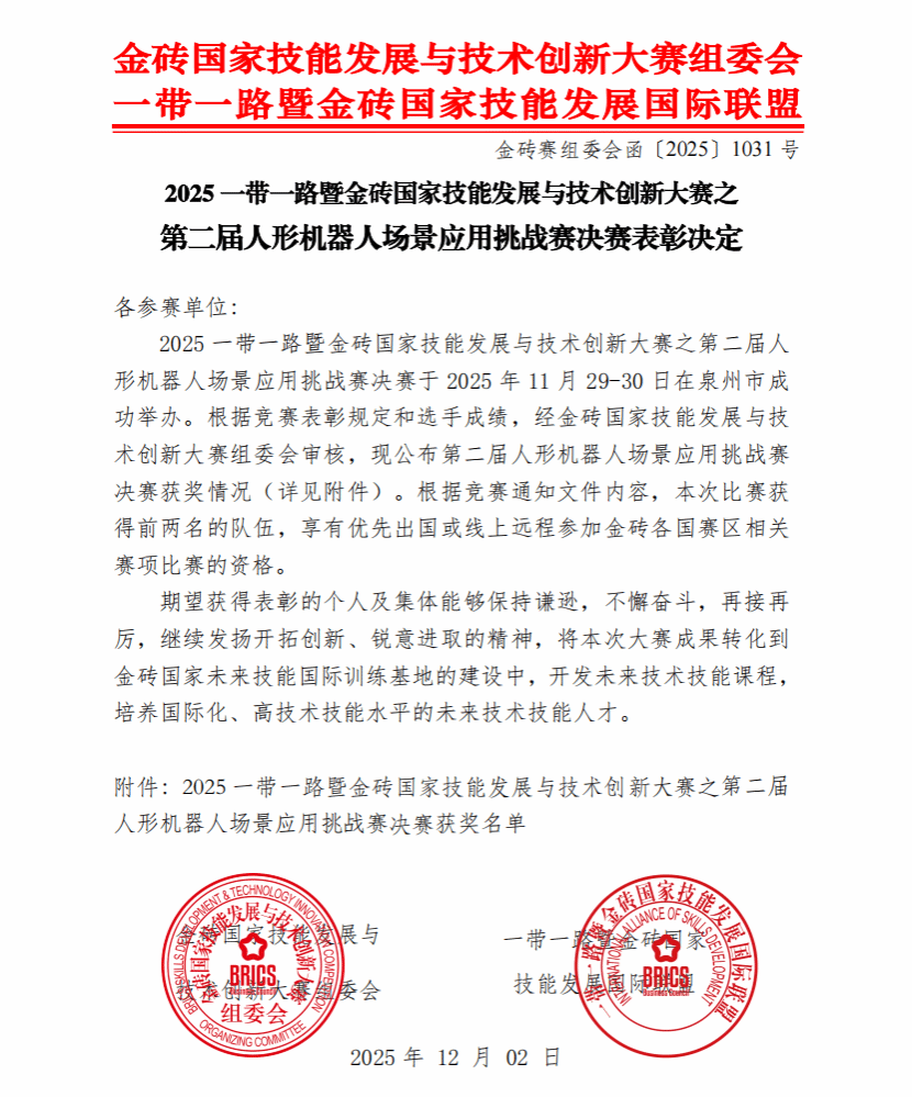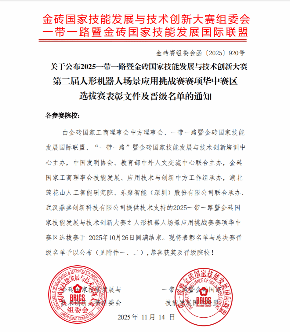 一带一路暨金砖国家技能发展与技术创新大赛(简称 “金砖大赛”)是经金砖国家工商理事会批准、外交部备案的国际级赛事,已连续九年写入《金砖国家工商理事会工作报告》并呈报金砖各国最高领导人,同时也是中国高等教育学会大学生竞赛分析报告竞赛目录赛事,是检验高校人才培养质量和技术创新能力的重要平台。本届大赛的第二届人形机器人场景应用挑战赛,聚焦人形机器人技术应用前沿,华中赛区选拔赛于10月25日-26日在湖北鄂州举办,吸引了区域内多所院校的优秀队伍同台竞技,全国总决赛则于12月6日至7日在泉州华光职业学院拉开战幕,汇聚了全国各赛区顶尖选手展开巅峰对决。