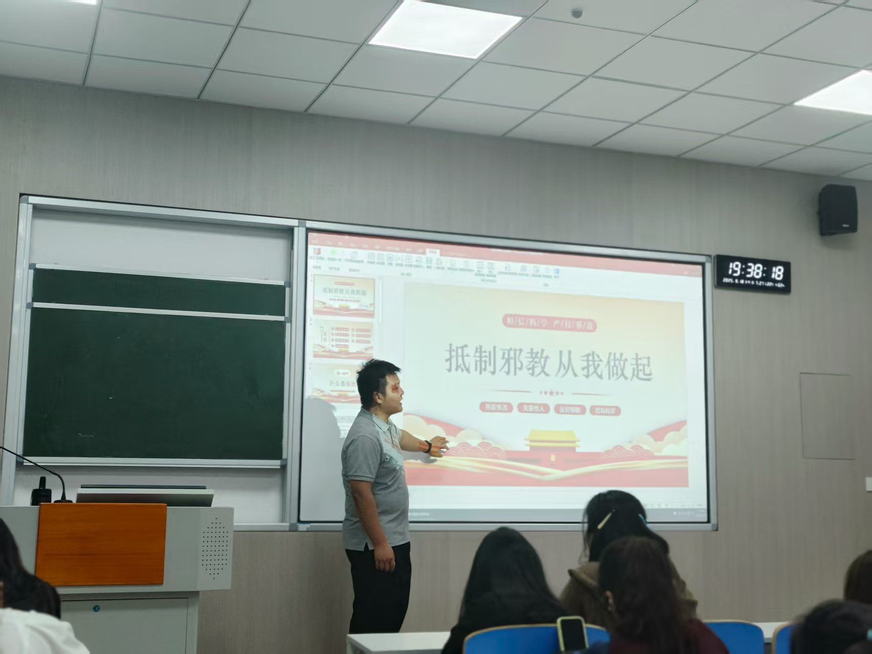 健康智慧科技学院党总支结合“三会一课”、主题党日活动,开展以“抵御宗教渗透,维护意识形态安全”为主题的思想教育活动。健康智慧科技学院党总支辅导员利用自习课时间给各班学生上反邪教主题教育思政课,广泛宣传党的宗教政策法规。同时鼓励班级学生,积极影响家庭、影响社会,认清宗教的本质。