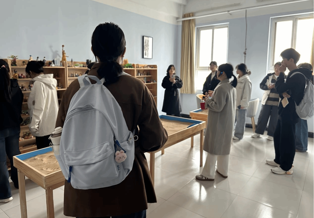 随后,同学们依次参观了个体咨询室、团体活动室、情绪宣泄室、沙盘游戏室、放松训练室等功能区域。在情绪宣泄室,专业的宣泄设备吸引了不少同学驻足,老师解释:“当情绪需要释放时,这里能成为大家安全的‘情绪出口’,帮助缓解压力。”在沙盘游戏室,摆放整齐的沙具让同学们充满好奇。心理老师现场演示了沙盘游戏的基本流程:“通过摆放沙具,同学们可以在‘无声的表达’中梳理内心困惑,老师也可以通过沙盘作品,帮助大家探索潜意识里的需求。”