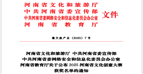 近日,喜讯传来!在河南省文化和旅游厅、中共河南省委宣传部、中共河南省委网络安全和信息化委员会办公室、河南省教育厅等四部门联合主办的2025河南省文化创意大赛中,我校学子表现亮眼,两支参赛团队分别斩获“在校大学生组”银奖和铜奖。
