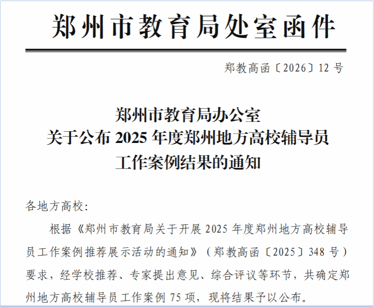 近日,郑州市教育局公布2025年度郑州地方高校辅导员工作案例评选结果,共确定75项优秀案例。我校选送的3项案例全部入选,充分彰显了学校辅导员队伍的专业能力和育人工作的实践成效。