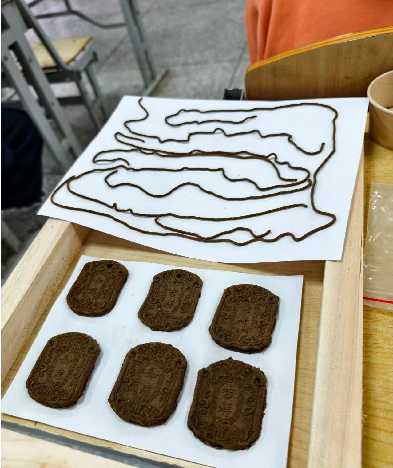 随后的DIY环节将活动推向高潮。同学们纷纷化身“非遗手艺人”,在线香与香牌两个制作区有序展开创作。在香粉配比区,大家严谨对照古方,将玫瑰、崖柏等天然香材精准称重、细心调配;揉泥台前,同学们反复揉捏、捶打着香泥,直至其达到细腻温润的最佳状态;在挤香器下,力道均匀地挤压,一根根形态笔直、粗细均匀的线香缓缓成型;模具区内,压印着“吉祥”等蕴含美好期望的香牌,更显古风雅韵。整个过程中,同学们互帮互助,修整瑕疵、标注信息,在专注与协作中,深刻体会着传统匠人“半之再半,循序渐进”的严谨精神。
