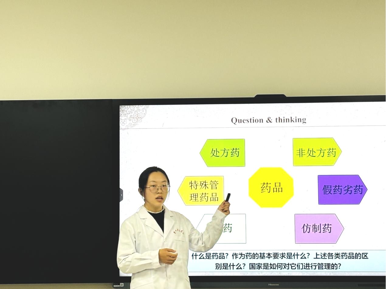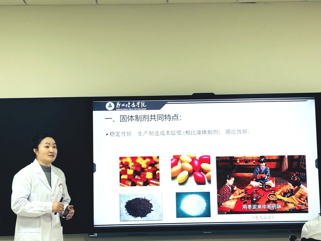 本次活动共有7名教师进行试讲,内容涵盖中药学、中药制药、药品经营与管理专业的核心课程。教师们认真研读大纲、精心打磨,不仅展示了扎实的教学功底,更通过别出心裁的课堂设计,诠释了各自独特的教学理念与风采。齐蕊老师讲授了《商务礼仪》课程中的“会面礼仪”、王煜茜老师讲授了《药事管理与法规》课程中的“药品辨识”,李凤英老师讲授了《中药药剂学》课程中的“固体制剂”,白义萍老师讲授了《中药调剂学》课程中的“中药饮片调剂”,王虹老师讲授了《中药学》课程中的“攻下药-大黄”,柴逸飞老师讲授了《药品生产质量管理规范》课程中的“认识GMP”,任智先老师讲授了《药剂学》课程的“绪论”。