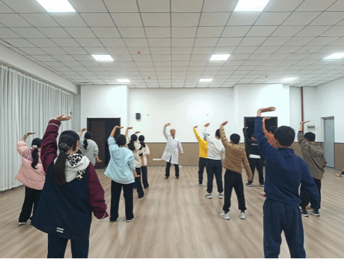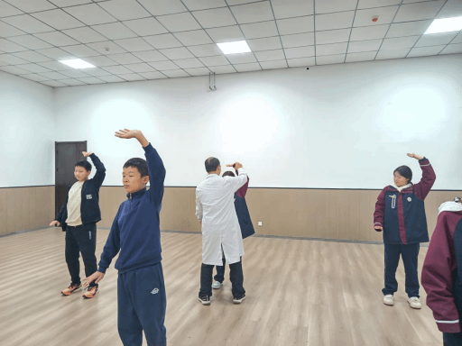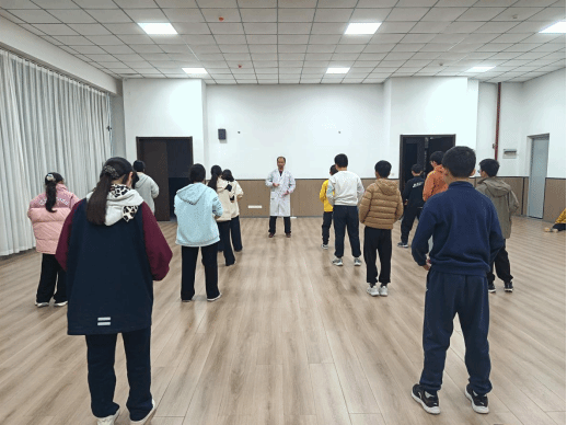 在授课过程中,我院教师充分发挥专业优势,特别指出中原地区饮食习惯、气候特点等因素易对脾胃功能产生影响,强调了脾胃作为“后天之本”对于青少年营养吸收、体质强健的重要性。在拆解“调理脾胃须单举”动作时,孙超龙老师详细分析了其动作原理,通过一手上举、一手下按的上下对拉,有效调理脾经和胃经,促进中焦气血运行,从而达到调理脾胃、和畅气机的效果。这种将传统功法动作与中医脏腑理论、现代健康理念以及地域体质特征紧密结合的讲解方式,极大地拓宽了学生们的健康知识视野。
